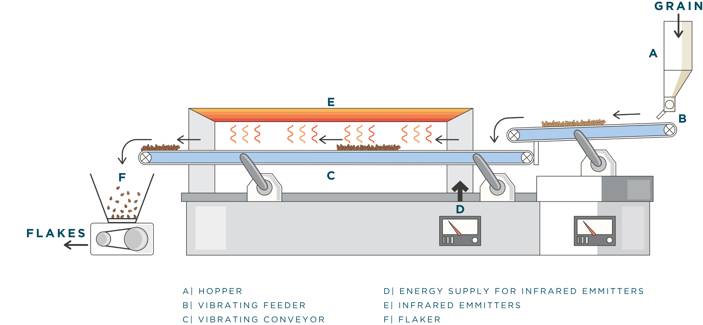 Once the degermed grits arrive at the facility, they move through a rapid two-stage process that transforms raw cereal into a brewery-ready adjunct. The grits travel along a heated steel conveyor beneath gas-fired infrared burners, cooking from both above and below for roughly 60–80 seconds. They then fall directly into a pair of heavy flaking rolls, each weighing approximately 1.5 tonnes, which flatten them to about 0.2mm thick.